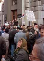 Protestni skup penzionera u organizaciji Nezavisnog udruzenja penzionera Srbije koji je juce odrzan ispred zgrade republicke vlade okupio je nekoliko stotina ogorcenih i revoltiranih ljudi.Iako je skup najavljen pismom Mirku Marjanovicu predsedniku republicke vlade jos pre dva dana delegacija penzionera uzaludno je cekala ispred masivnih hrastovih vrata da ih neko primi. Ovo je izazvalo revolt nekolicine penzionera koji su svoj protest nastavili "lezeci" na tramvajskim sinama zbog cega je saobracaj u ovom delu Nemanjine ulice bio blokiran od pola dvanaest do podneva. "Umesto obecane tri polumesecne isplate u oktobru su dobili, i to sa zakasnjenjem, samo drugi deo avgustovske penzije. Pritom nije postovan zakonski propis o uskladjivanju penzija sa rastom zarada zbog cega smo zakinuti za 20,1 odsto ili 230 miliona dinara. Zbog stimovanja statistickih podataka u ovoj godini bicemo zakinuti za 1,5 penziju, cemu treba dodati i dug od 2,5 penzije iz 94 i 95 godine", rekao je Milan Djuric, predsednik NUPS. Ministar Tomic je pred izbore obecao penzionerima ubrzanu dinamiku isplate da bi nakon toga njegov kolega, ministar finansija, izjavio da od toga nema nista. Republicka vlada, ocigledno, ne priznaje penzionere kao drustveni sloj koji se bori za svoja ljudska prava i postovanje zakonskih propisa. Necivilizacijski je i nekulturno sto nas niko od zvanicnika nije primio, porucio je Djuric okupljenim penzionerima . U ocekivanju odluke o isplati prvog dela septembarske penzije koja bi morala da ukljuci i neisplacenu razliku za avgust - tu odluku inace, republicka vlada trebalo bi da donese najkasnije polovinom ovog meseca - NUPS penzionerima preporucuje strpljenje. U suprotnom nastavice se sa protestnim skupovima, obecao je Djuric. Jednocasovni skup na vetrometini obezbedjivala je policijska ekipa koja je intervenisala samo da bi se "odblokirao" saobracaj.Predsednik NUPS je neobicnu protestnu "lezecu" akciju nekolicine penzionera ocenio kao emotivni akt zbog ojadjenosti, revolta i gladi. Jedan od prisutnih svoj uobicajeni jelovnik prezentirao je pozutelom glavicom kupusa.Uz odomacene pistaljke, i povike "Bando crvena" skup je upotpunjen i transparentima "Sto jes jes kod penzionera najjaci stres proizvodi SPS". "