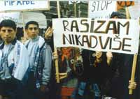 Nekoliko hiljada beogradskih Roma i nekoliko desetina Jevreja, protestovalo je juce na Trgu Republike, povodom Svetskog dana borbe protiv rasizma i antisemitizma, 9. novembra, ustanovljenog kao secanje na cuvenu "kristalnu noc" u kojoj je 1938. godine u Nemackoj oko 30.000 Jevreja poslato u koncentracione logore, a vise stotina pobijeno. Sa zajednickog skupa, poslali su poruku vlastima da zele da mirno zive u zajednici sa Srbima i da im je, nakon ubistva Dusana Jovanovica i ucestalih napada "skinhedsa", potrebna zastita. Predstavnici oba naroda izrazili su zaljenje sto na mitingu nije ucestvovalo vise Beogradjana, isticuci da je njihov izostanak "sramota za Srbiju", ali su odusevljeno prihvatili ucesce male grupe beogradskih pankera na mitingu. Prethodnica mitinga bila je protestna setnja Roma kroz strogi centar Beograda. Oko hiljadu pripadnika romske nacionalnosti okupilo se pred dragstorom u Beogradskoj ulici broj 33, gde su dvojica "skinsa", krajem oktobra brutalno ubila cetrnaestogodisnjeg Dusana Jovanovica. U povorci je, osim lidera Romske kongresne partije i romskih udruzenja, kao i Roma koji zive u Beogradu, bio i veliki broj Roma iz Nisa, Kragujevca, Cuprije i Cacka, koji su organizovanim prevozom stigli u prestonicu. Noseci transparente - "I nasa deca su deo ove zemlje", "Romi su lojalni Srbiji, budite i vi", "Nacisti, letite u nebo, Romi ostaju ovde" - oko pola cetiri posle podne krenuli su u protestnu setnju. U povorci su bili i pankeri iz Beograda, Kovina i Smedereva, koji su nosili transparente sa natpisima: "Srusimo zidove mrznje", "Omladina je protiv rasizma", "Rasizam - nikad vise". Uz dobro organizovano sopstveno obezbedjenje i uz vrlo malo "vidljivog" policijskog obezbedjenja, Romi su krenuli put Beogradske ulice, preko Slavije u Ulicu srpskih vladara, blokirajuci samo desnu stranu kolovoza. Kolonu je predvodila porodica tragicno nastradalog Duska.