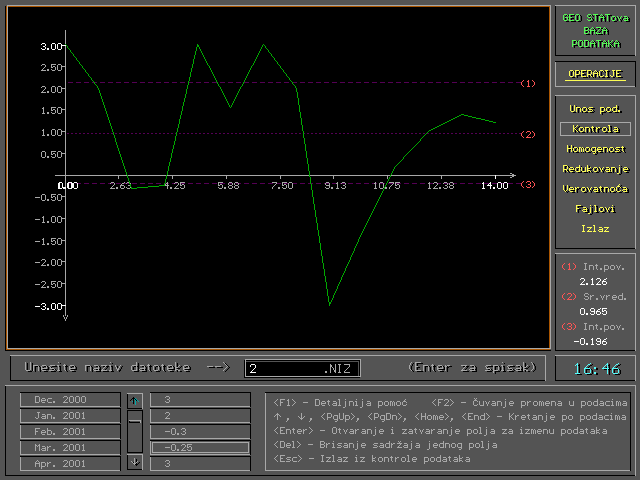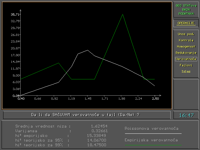 Program ne dozvoljava koriscenje odredjenih statistickih operacija ako prethodno nije izvrsena kontrola tacnosti podataka i provera homogenosti izvornog niza podataka. Homogenost se ispituje Studentovim testom. Ceo proces obrade podataka je osmisljen tako da je pre svakog proracuna neophodno da podaci budu propusteni kroz testove homogenosti i verovatnoce bar jedanput. Propustanjem podataka kroz pomenute testove Geostat cuva informacije o izvornim podacima koje su mu neophodne za njihovu dalju, slozeniju obradu. Ovim sistemom se postize to da pred svaku obradu podataka, program vec ima informacije o homogenosti, raspodeli (slika2) i kompletnosti niza koji obradjuje, pa u zavisnosti od njih primenjuje odredjene matematicke modele. Ovi rezultati se cuvaju u opisnom fajlu, koji pored vec pomenutih parametara, u sebi sadrzi i tip podataka (godisnji, mesecni, dnevni ili nehronoloski), datum od kojeg podaci pocinju (ako su hronoloski), kao i kratak opis fajla koji korisnik unosi, kako bi kasnije lakse raspoznao fajl koji trazi.