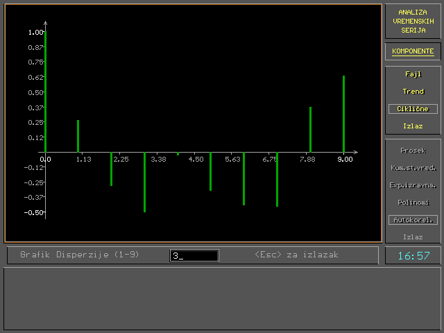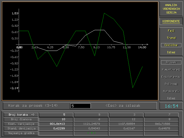 Ciklicna komponenta se moze izdvojiti pomocu pokretnog proseka (slika 3), kumulante standardizovanih vrednosti, eksponencijalnog izravnanja, polinoma od treceg do desetog stepena i pomocu autokorelacije (slika 4). Za vizuelno utvrdjivanje jacine i oblika veze izvornog i pokretnog niza na odredjenom koraku autokorelacije, koristi se opcija za graficki prikaz rasturanja empirijskih tacaka.