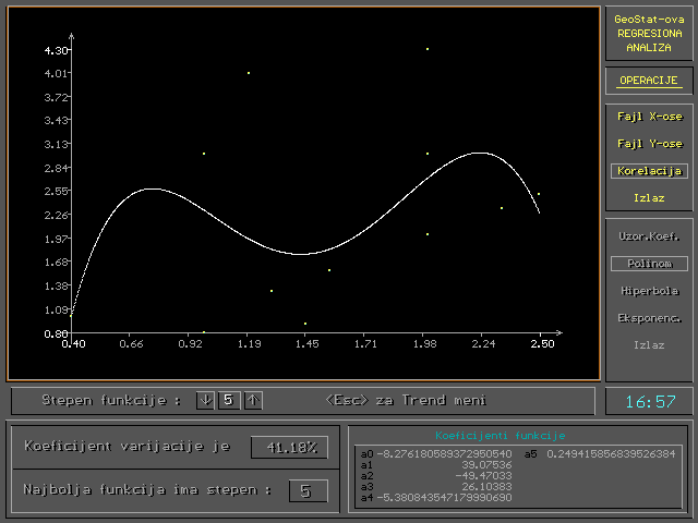 Korelaciona analiza se zasniva na izracunavanju oblika i jacine funkcionalne veze izmedju dve pojave. Po unosenju niza podataka koji ce biti na X-osi, odnosno na Y-osi, korisniku se daje mogucnost da ispita uzoracki koeficijent korelacije ili da kroz dobijeni grafik provuce linearnu funkciju, parabolu, polinom ili hiperbolu do desetog stepena (slika 5). Automatski se proracunava greska, kao i koeficijent korelacije za dati teorijski matematicki model. Ova opcija nam omogucava da matematicki izracunamo zavisnost izmedju dve pojave i da utvrdimo da li je taj stepen zavisnosti zanemarljiv ili ne.
