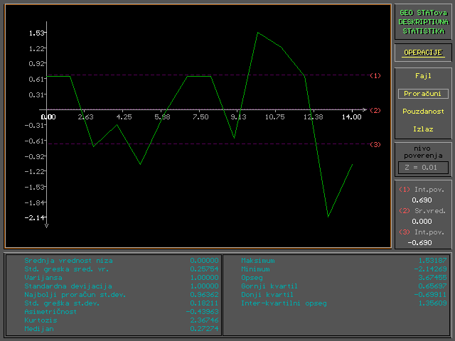 Deskriptivna statistika je deo Geostat-a koji za zadati niz podataka izracunava najcesce koriscene statisticke pokazatelje, kao sto su: Srednja vrednost niza, Standardna greska srednje vrednosti, Varijansa, Standardna devijacija, Najbolji proracun standardne devijacije, Stdandardna greska standardne devijacije, Asimetricnost, Kurtozis, Medijan, Maksimum, Minimum, Opseg, Gornji kvartil, Donji kvartil i Inter-kvartilni opseg. U okviru Deskriptivne statistike postoji mogucnost da se neke od ovih vrednosti direktno ucrtaju na grafik, tako da je provera rezultata olaksana (slika 6). Mogucnost promene nivoa poverenja nam na grafiku omogucuje vecu preglednost podataka.
